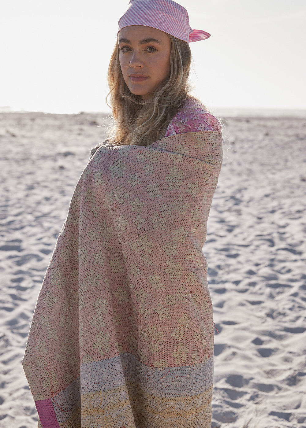 Kantha, a centuries-old art form, is more than just a craft—it's a tradition steeped in history and creativity. Originating in Bengal, India, the kantha technique involves layering worn-out saris and fabrics, meticulously hand-stitching them together with a simple running stitch. The result is a uniquely textured kantha blanket, known for its vibrant colors, intricate patterns, and sustainability. Each kantha quilt tells a story, woven from memories of the past and transformed into a new creation full of charm.